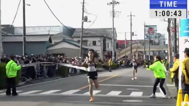 Rui Aoki gewann den 36. Ageo City Halbmarathon in der Streckenrekordzeit von 1:00:45. (c) Livestream/Screenshot