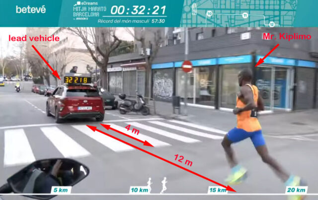 Jacob Kiplimo auf Rekordjagd in Barcelona. Nach Auffassung von WA war das Führungsfahrzeug zu nahe am Läufer und bot eine nicht zulässige Unterstützung. (c) Livestream/Screenshot