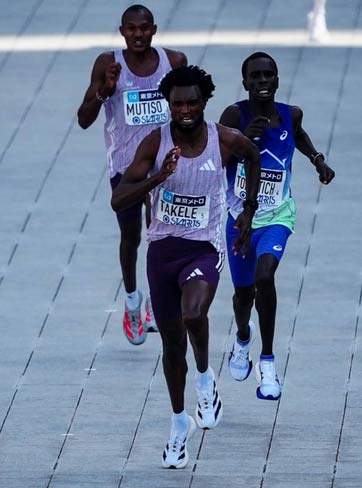 Knapper Zieleinlauf bei Tokyo Marathon 2026: Takele vor Toroitich und Mutiso. (c) Japan Times