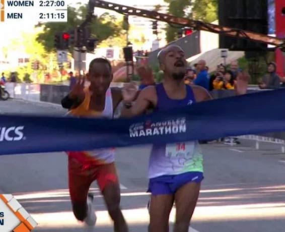 Nathan Martin gewann nach einer gandiosen Aufholjagd den LA Marathon vor Michael Kamau. (c) Livestream/Screenshot
